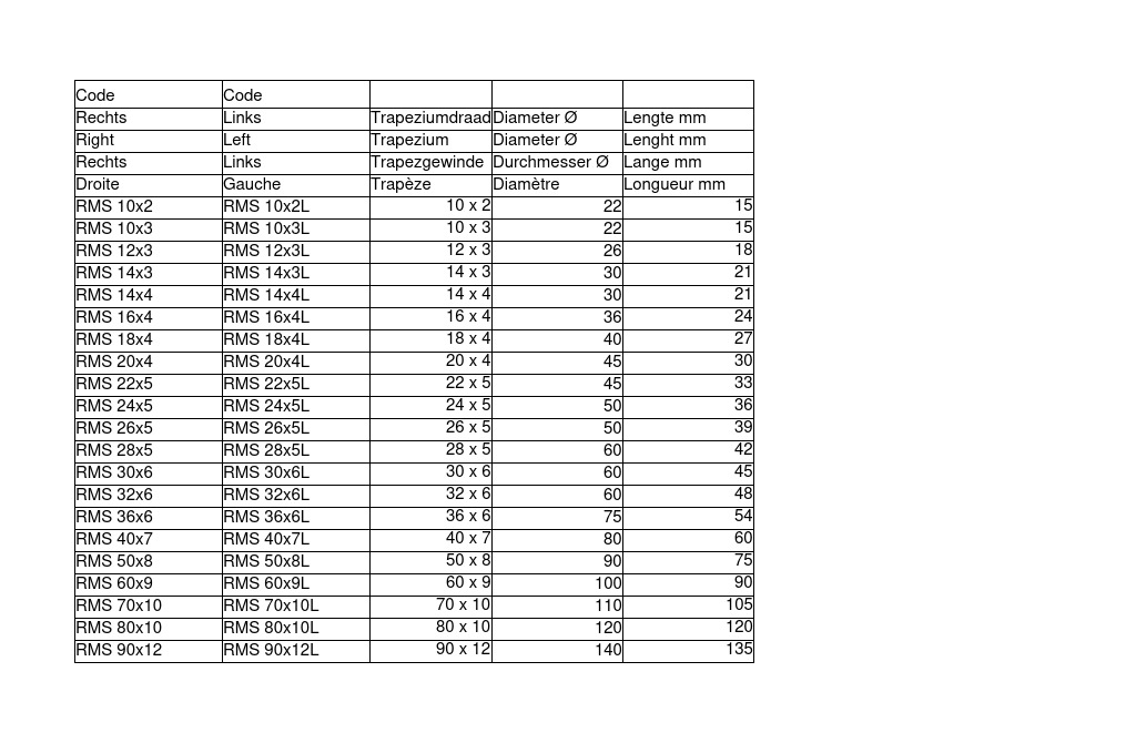 • Afmeting trapeziumdraad moer